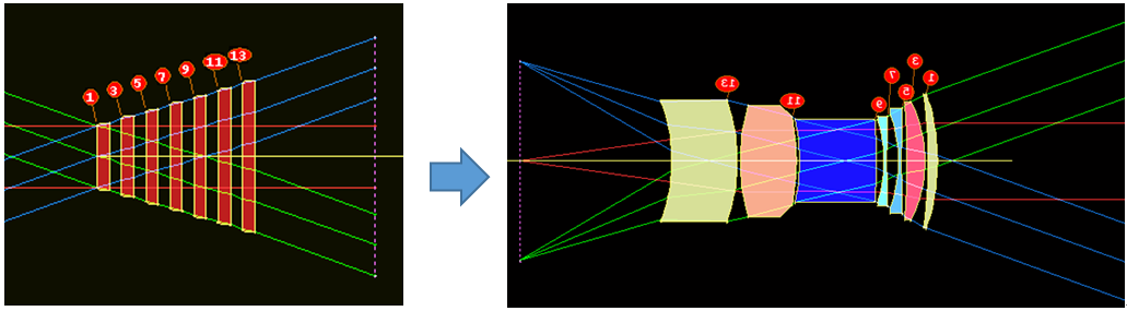鏡頭搜索功能: 輸入所要設(shè)計的系統(tǒng)的使用波長、相對孔徑,視場等參數(shù),軟件即可從自帶的鏡頭庫中找出相應(yīng)的結(jié)構(gòu)以供選擇。